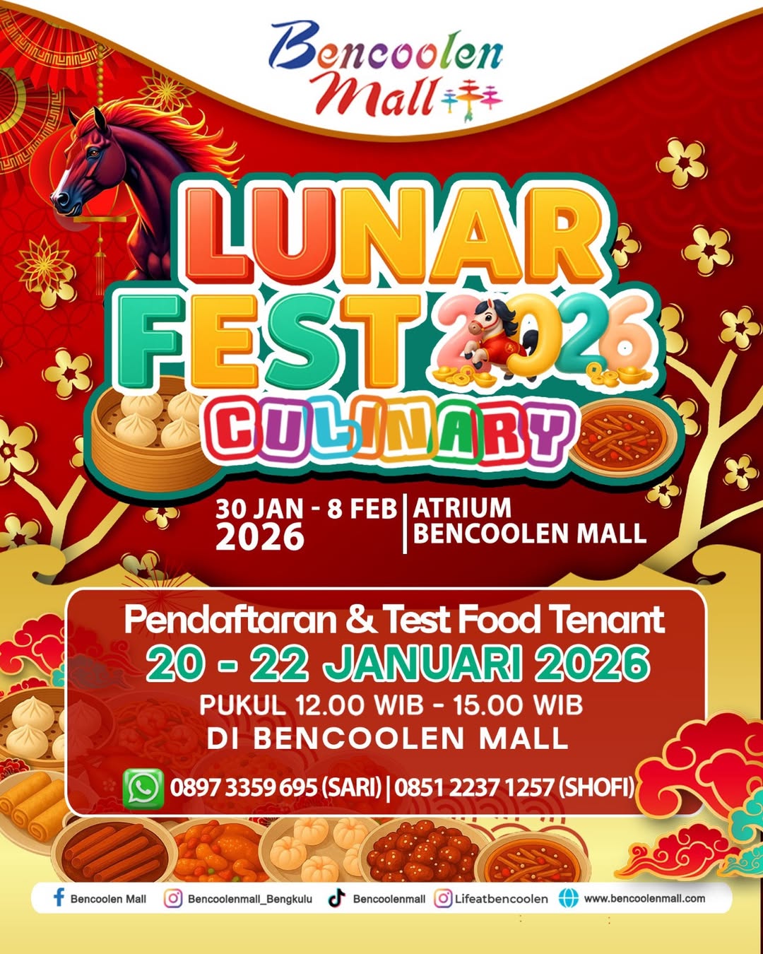 Kepala Divisi Marketing dan Event Bencoolen Mall, Wiji Lestari, mengatakan Lunar Fest Culinary menjadi ruang bagi pelaku usaha makanan dan minuman untuk memperluas pasar sekaligus memperkenalkan produknya kepada pengunjung mall. ”Event ini selalu mendapat antusiasme tinggi dari pengunjung,” kata Wiji, yang akrab disapa Wiwid, Sabtu, 17 Januari 2026.