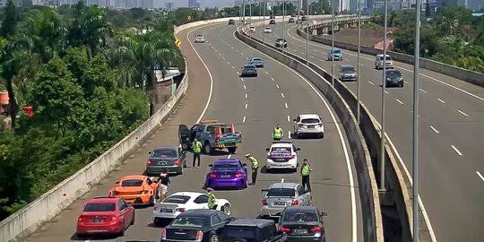 “Polri Sat PJR Dit Lantas PMJ melakukan Penindakan kepada Para Pengemudi kendaraan mobil mewah yang beriringan yang sedang melaksanakan dokumentasi di dalam Ruas Tol sehingga menyebabkan kemacetan dan mengganggu Pengemudi lain di KM 02+400 Andara,” kutip akun tersebut.