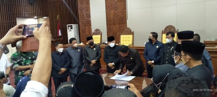 Gubernur Bengkulu Rohidin Mersyah mengapresiasi kepada seluruh Anggota DPRD yang telah mencurahkan tenaga dan fikirannya dalam membahas Raperda tersebut hingga disetujui menjadi Perda Provinsi Bengkulu tahun 2022. (Bay)