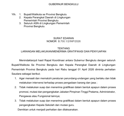Arahan tersebut merupakan tindak lanjut dari hasil Rapat Koordinasi antara Gubernur Bengkulu dengan seluruh Bupati/Walikota se-Provinsi Bengkulu serta kepala Perangkat Daerah di lingkungan Pemerintah Provinsi Bengkulu yang digelar pada Rabu, 1 April 2026.