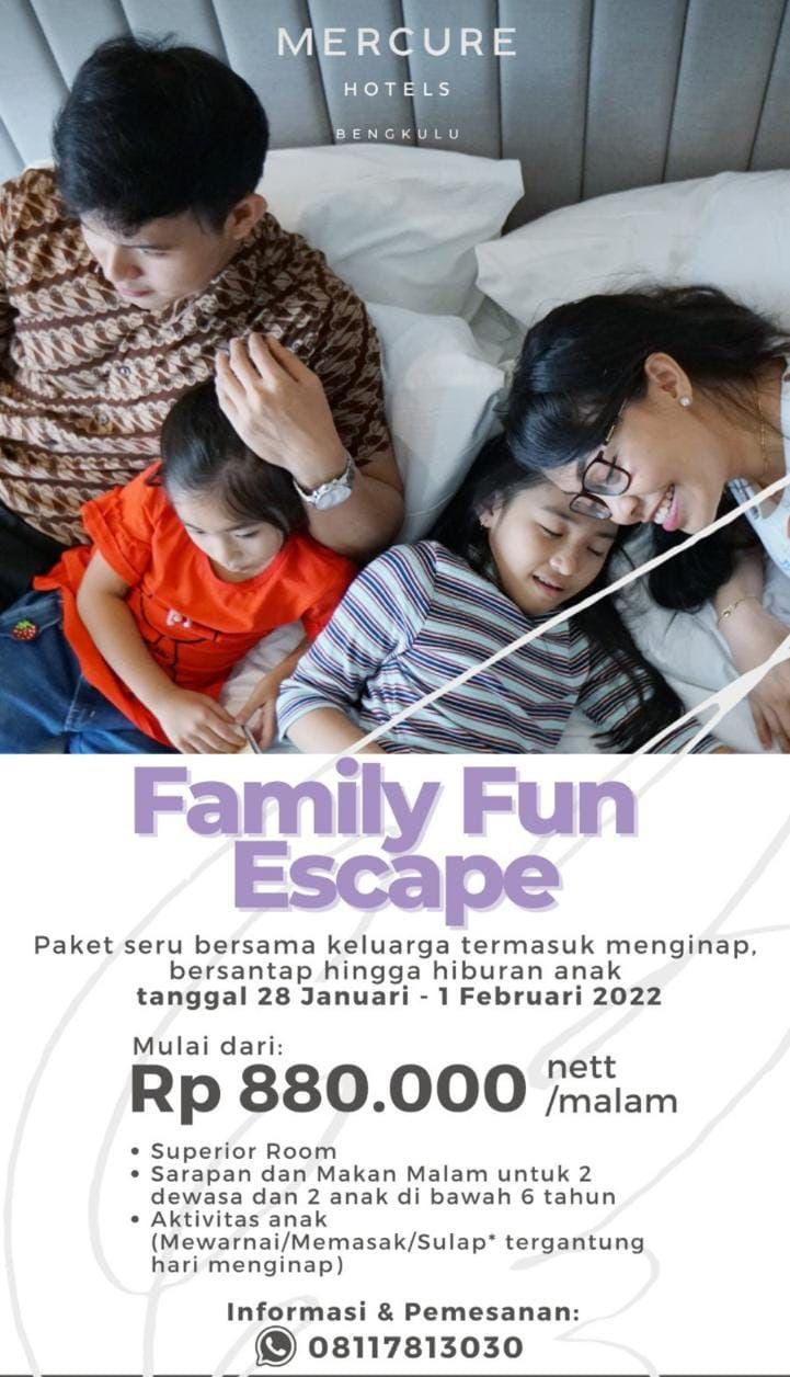 “Jadi untuk keluarga yang ingin mengajak anak untuk liburan dengan moment tidak terlupakan maka segera ajak anak-anak kalian dan booking langung! tunggu apa lagi? kesempatan tidak datang 2 kali. Ingat, promo ini hanya berlaku dari tanggal 28 Januari sampai dengan 1 Febaruari,” ajak Communication Manager Mercure Hotel Bengkulu, Putri Cempaka Sari, Rabu (26/1/2022).