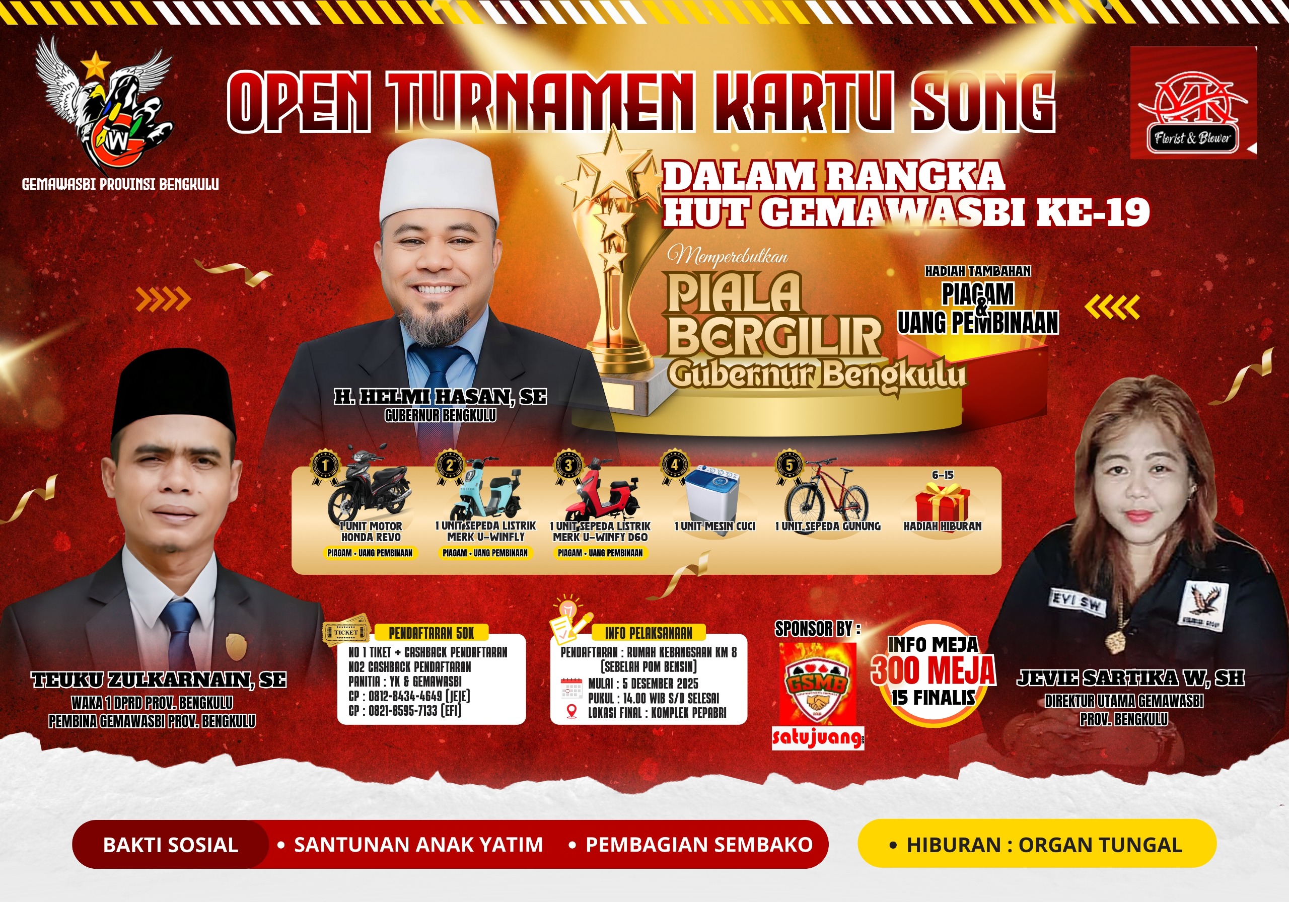 BencoolenTimes.com – Hut Gemawasbi (Gerakan Masyarakat Pengawas Birokrasi) Ke-19 Provinsi Bengkulu, akan digelar Open Turnamen Kartu Song, Piala Gubernur Bengkulu. Berbagai hadiah menarik, mulai dari motor, sepeda listrik, mesin cuci, sepeda gunung dan uang pembinaan disertai hadiah menarik lainnya.
