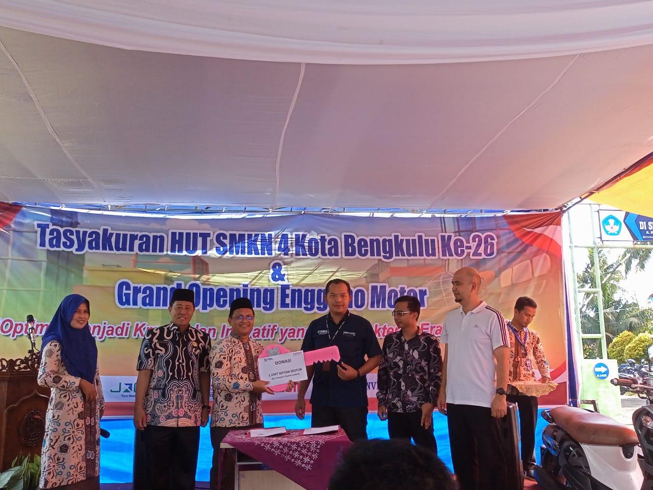 Disela potong tumpeng, PT. Thamrin Brothers Yamaha memberikan satu unit motor merek Fino untuk alat praktek siswa SMK 4 Kota Bengkulu. (JRS)