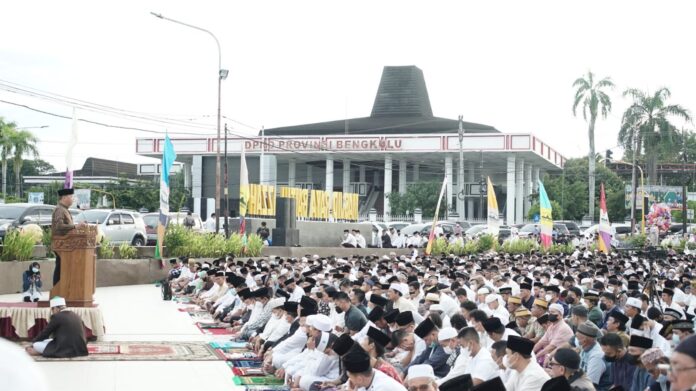 “Mari kita jaga terus nilai – nilai Ramadhan yaitu semangat kemampuan mengendalikan diri, rasa peduli, semangat berbagi, kemudian rasa bersilaturahmi dan saling memaafkan. Ini nilai – nilai yang sangat penting harus selalu kita jaga dan mudah – mudahan sampai bertemu Ramadhan berikutnya,” ungkap Gubernur Bengkulu Rohidin Mersyah usai melaksanakan sholat EID di halaman Masjid Raya Baitul Izzah Bengkulu, Senin (2/5/2022).