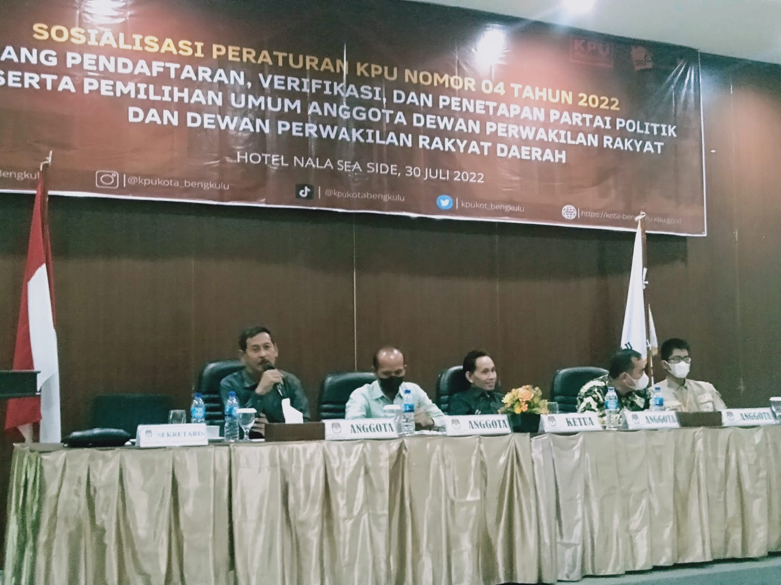 BencoolenTimes.com, – Komisi pemilihan Umum (KPU) Kota Bengkulu mensosialisasikan PKPU (Peraturan Komisi pemilihan Umum) nomor 4 tahun 2022 kepada para Parpol (Parpol) di Hotel Nala Sea Side di Pantai Panjang Kota Bengkulu. Sabtu, (30/07/2022).
