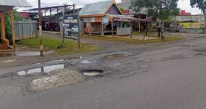Tampak terlihat, jalan Danau Raya berlubang dalam dan digenangi air hujan sehingga tak terlihat terlihat oleh pengendara.