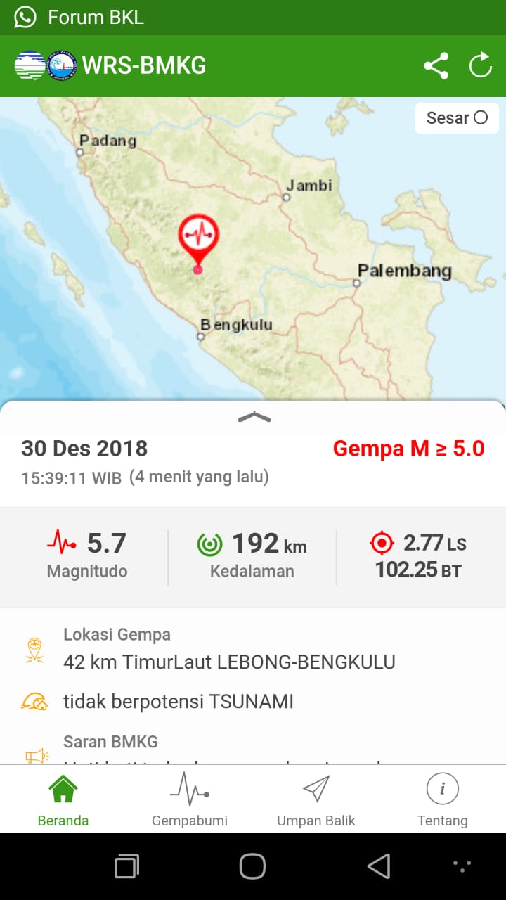 BencoolenTimes.Com, – Jelang akhir tahun, Bengkulu diguncang gempa 5,7 Mag tepat saat azan Ashar berkumandang, Minggu (30/12/2018) pukul 15.39 WIB.