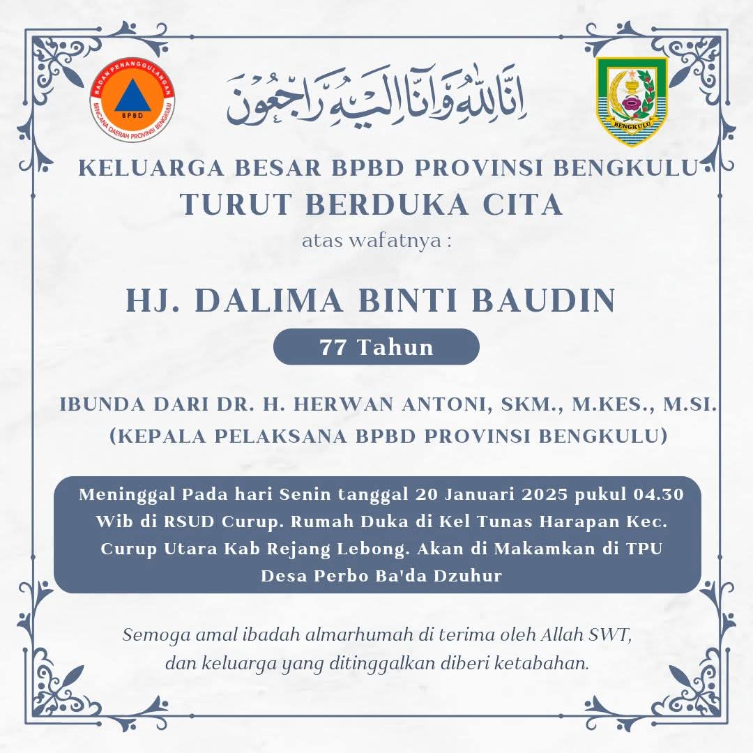 BencoolenTimes.com – Kabar duka datang dari Kepala Pelaksana (Kalak) Badan Penanggulangan Bencana Daerah (BPBD) Provinsi Bengkulu, Herwan Antoni. Ibunda tercinta, Dalima Binti Baudin (77) telah berpulang ke rahmatullah, Senin, 20 Januari 2025, pukul 04.30 WIB di RSUD Curup.