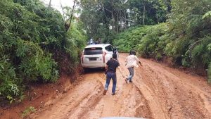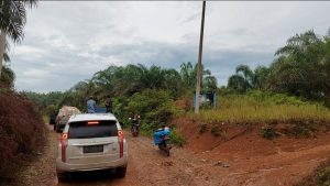 Jalannya tanah liat dan koral. Belum lagi, hujan yang mengguyur membuat jalur ini makin sulit di tempuh. Beberapa kendaraan yang tak ada double gardan, dititipkan ke rumah warga terdekat.