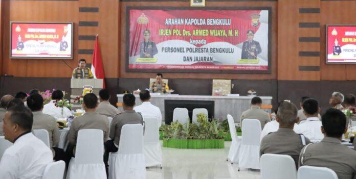 Selanjutnya, Kapolda Bengkulu melakukan sejumlah rangkaian kegiatan dan menuju Aula Endra Dharmalaksana untuk memberikan Arahan internal kepada personel Polresta Bengkulu dan jajaran.