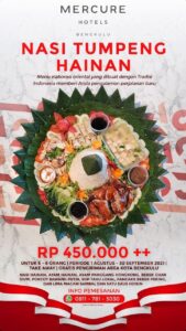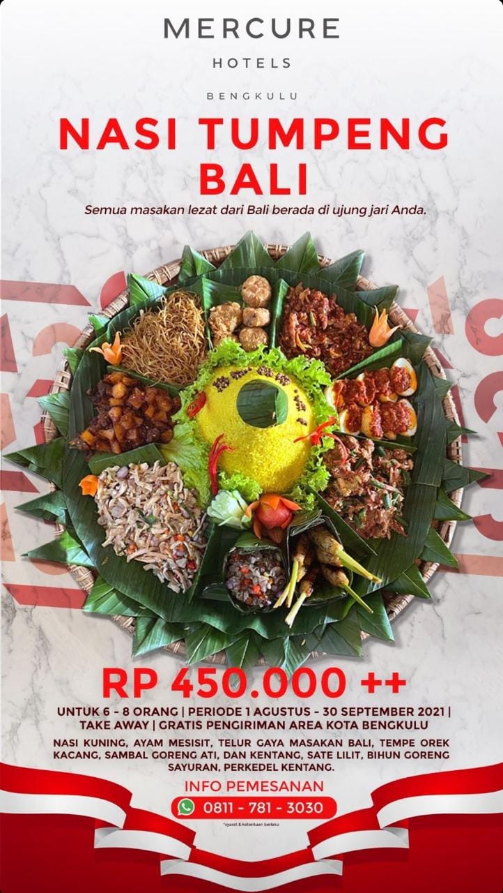 “Menu pilihan Nasi Tumpeng Hainan (China) adalah menu elaborasi oriental yang dibuat dengan tradisi Indonesia dan Nasi Tumpeng Bali dengan cita rasa khas Bali yang dapat pengunjung rasakan di Hotel Mercure Bengkulu,” jelas Putri, 14 Sepetember 2021.