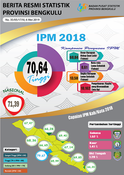 Pada tahun 2018, IPM Provinsi Bengkulu mencapai 70,64. Angka ini meningkat sebesar 0,69 poin atau tumbuh 0,99 persen dibandingkan tahun 2017 yang sebesar 69,95.