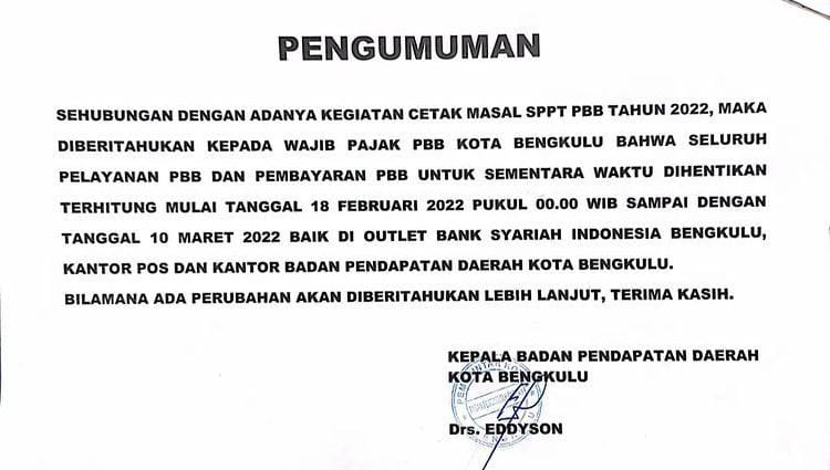 Kepala Bapenda Kota Bengkulu, Eddyson mengatakan, berhubungan dengan adanya kegiatan cetak massal SPPT PBB tahun 2022 maka diberitahukan kepada wajib pajak PBB Kota Bengkulu bahwa seluruh layanan PBB dan pembayaran PBB untuk sementara dihentikan.