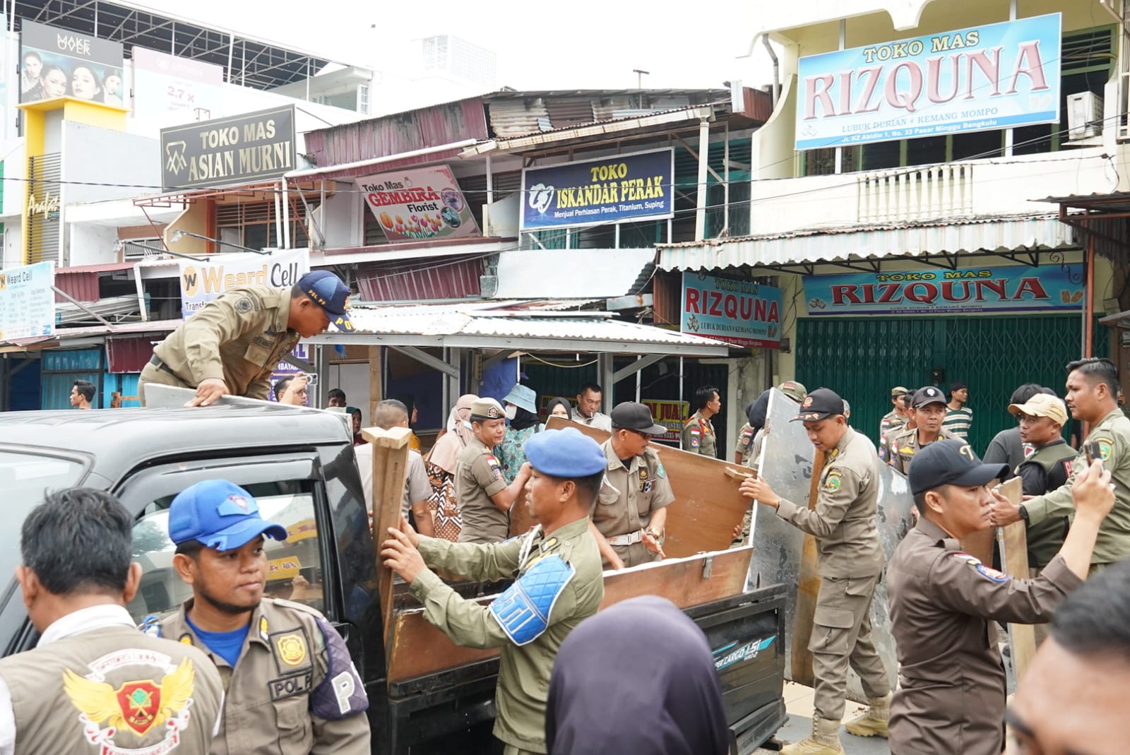Dalam kegiatan tersebut, petugas Satpol PP turut mengangkut sejumlah lapak pedagang yang berada di depan toko emas. Lapak-lapak tersebut dibawa menggunakan truk ke kantor Satpol PP Kota Bengkulu. (JUL/RMC)
