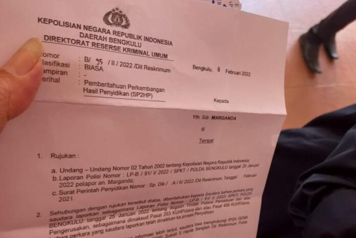 Tarmizi gumay selaku pihak dari korban mengambil surat pemberitahuan perkembangan hasil penyidikan (SP2HP) dari Direktorat Reserse Kriminal Umum Polda Bengkulu (Ditreskrimum) Polda Bengkulu Selasa kemarin (9/2).