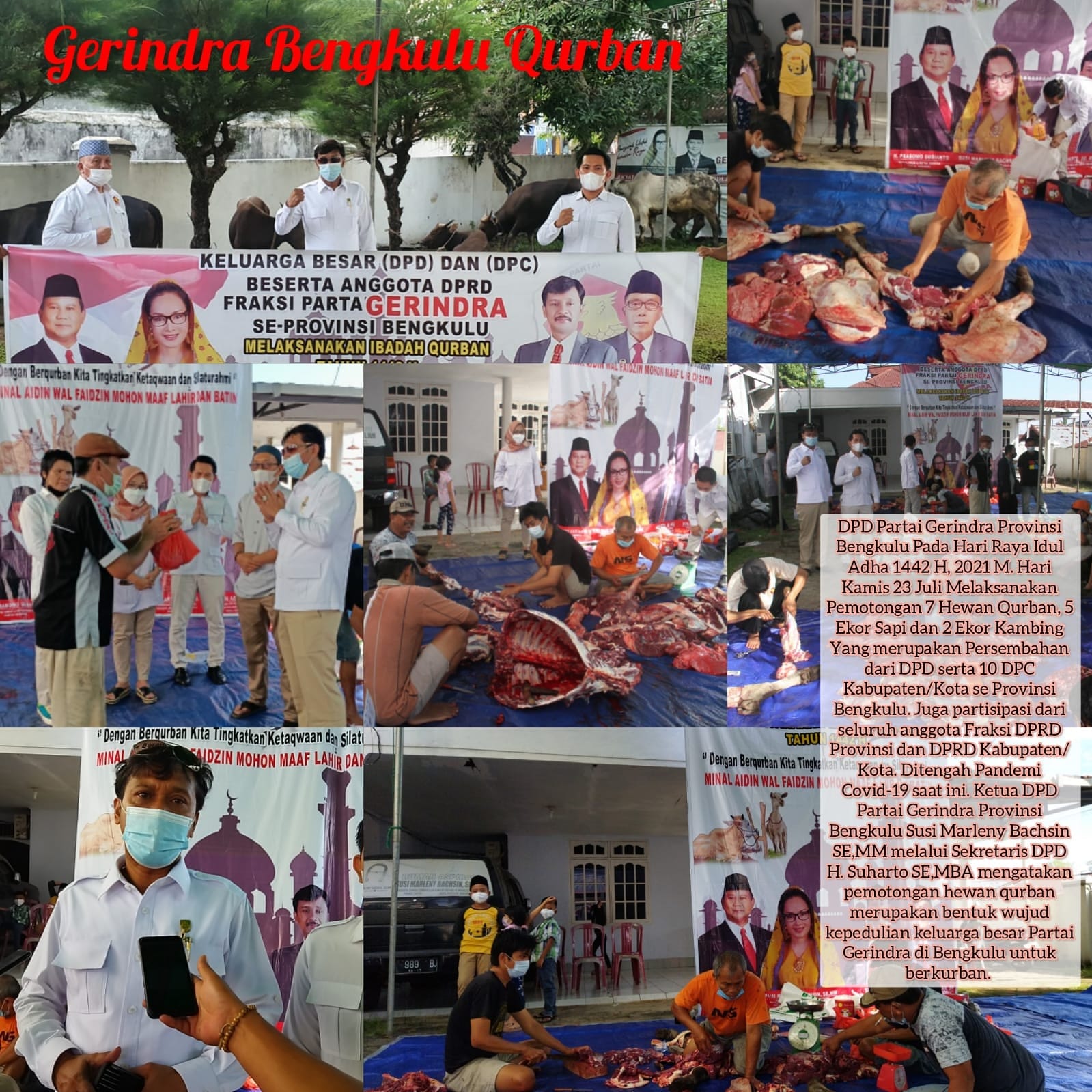 Ketua DPD Partai Gerindra Provinsi Bengkulu Susi Marleny Bachsin, melalui Sekretaris Partai Gerindra Provinsi Bengkulu Suharto mengatakan, kurban ini merupakan wujud kebersamaan para kader Partai Gerindra meningkatkan ibadah. Meskipun penuh ujian khususnya di Provinsi Bengkulu dan Indonesia pada umumnya yakni dihadapkan dengan wabah pandemi tapi tetap melaksanakan ibadah.