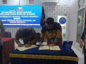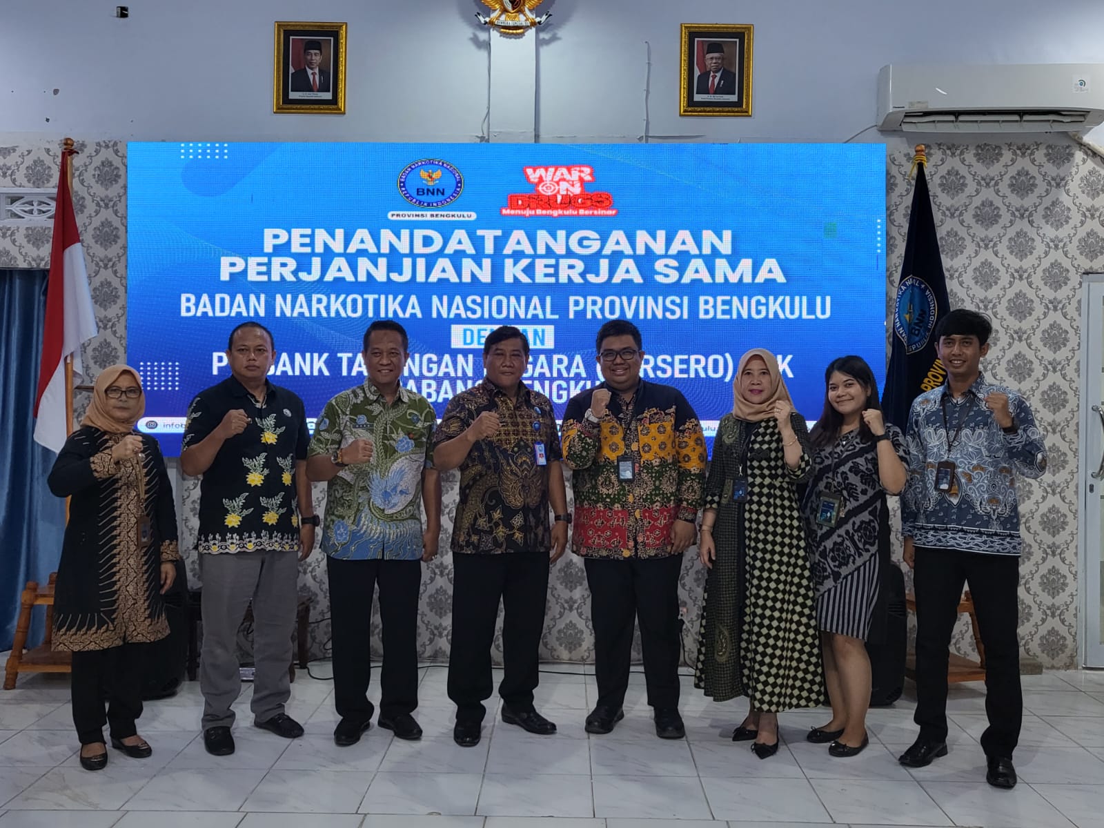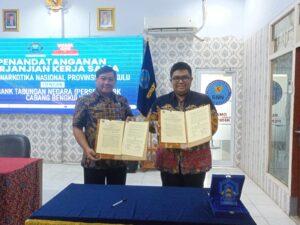 BencoolenTimes.com, – PT. Bank Tabungan Negara (BTN) Tbk, Kantor Cabang Bengkulu melakukan penandatanganan perjanjian kerjasama atau Memorandum Of Understanding (MoU) dengan Badan Narkotika Nasional Provinsi (BNNP) Bengkulu tentang Pencegahan dan Pemberantasan Penyalagunaan dan Peredaran Gelap Narkotika (P4GN) dan Prekursor Narkotika dan Pemanfaatan Jasa Layanan Perbankan wilayah Provinsi Bengkulu di Kantor BNN Provinsi Bengkulu, Selasa (23/5/2023).
