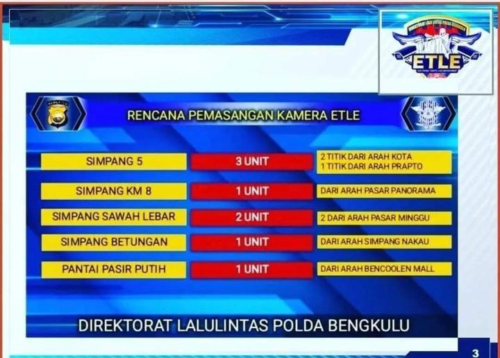 Kabid Humas Polda Bengkulu Kombes Pol Sudarno, S. Sos, MH, saat dikonfirmasi, Minggu (30/10/2022) membenarkan adanya rencana penambahan kamera ETLE yang akan dilakukan oleh Direktorat Lalu Lintas Polda Bengkulu tersebut.