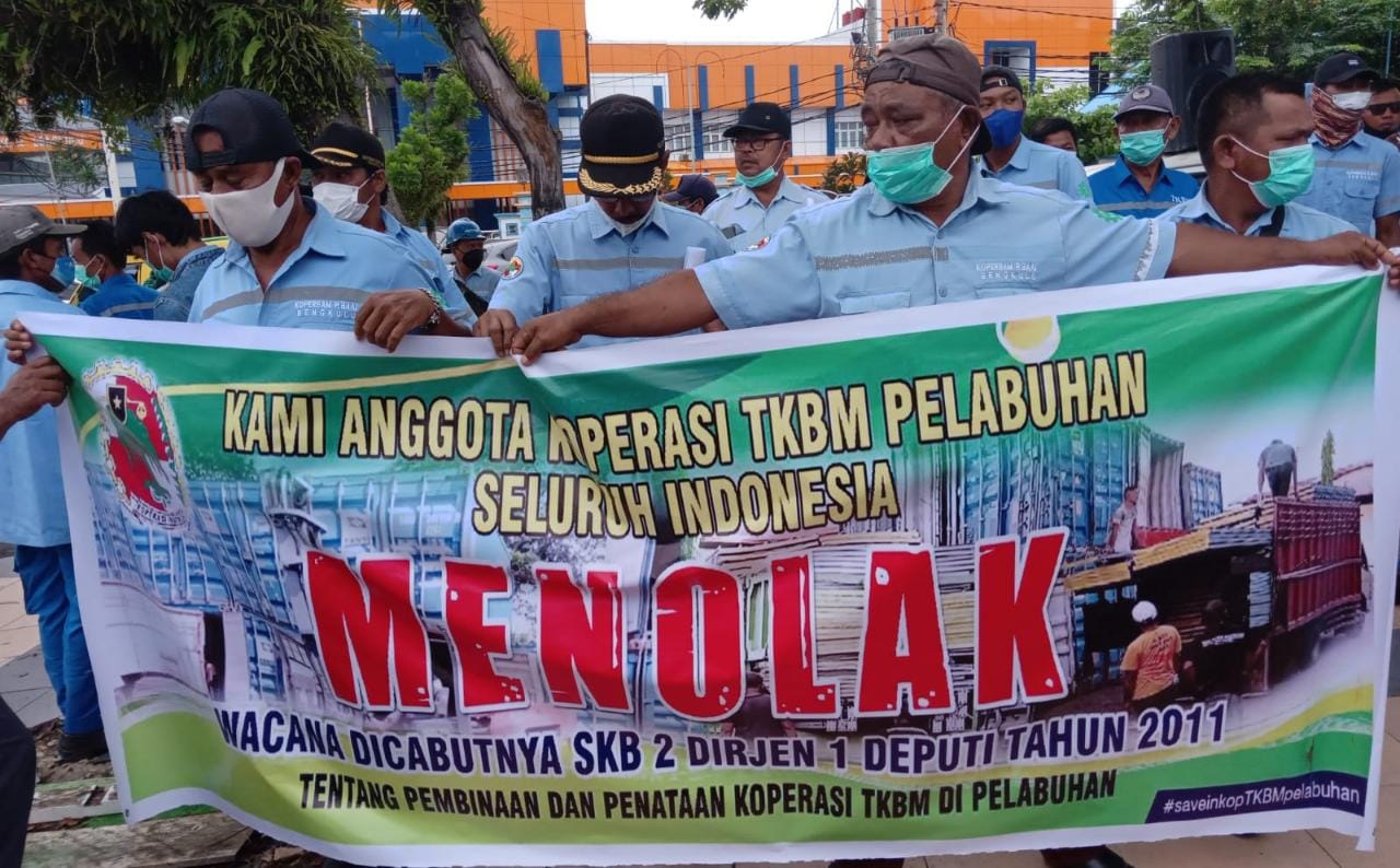 BencoolenTimes.com, – Para anggota koperasi Tenaga Kerja Bongkar Muat (TKBM) Pulau Baai melakukan aksi damai menolak wacana dicabut SKB 2 Dirjen dan 1 Deputi Tahun 2011 tentang pembinaan dan penataan koperasi TKBM di pelabuhan di depan Kantor Dinas Tenaga Kerja Kota Bengkulu, Senin (31/01/2022).