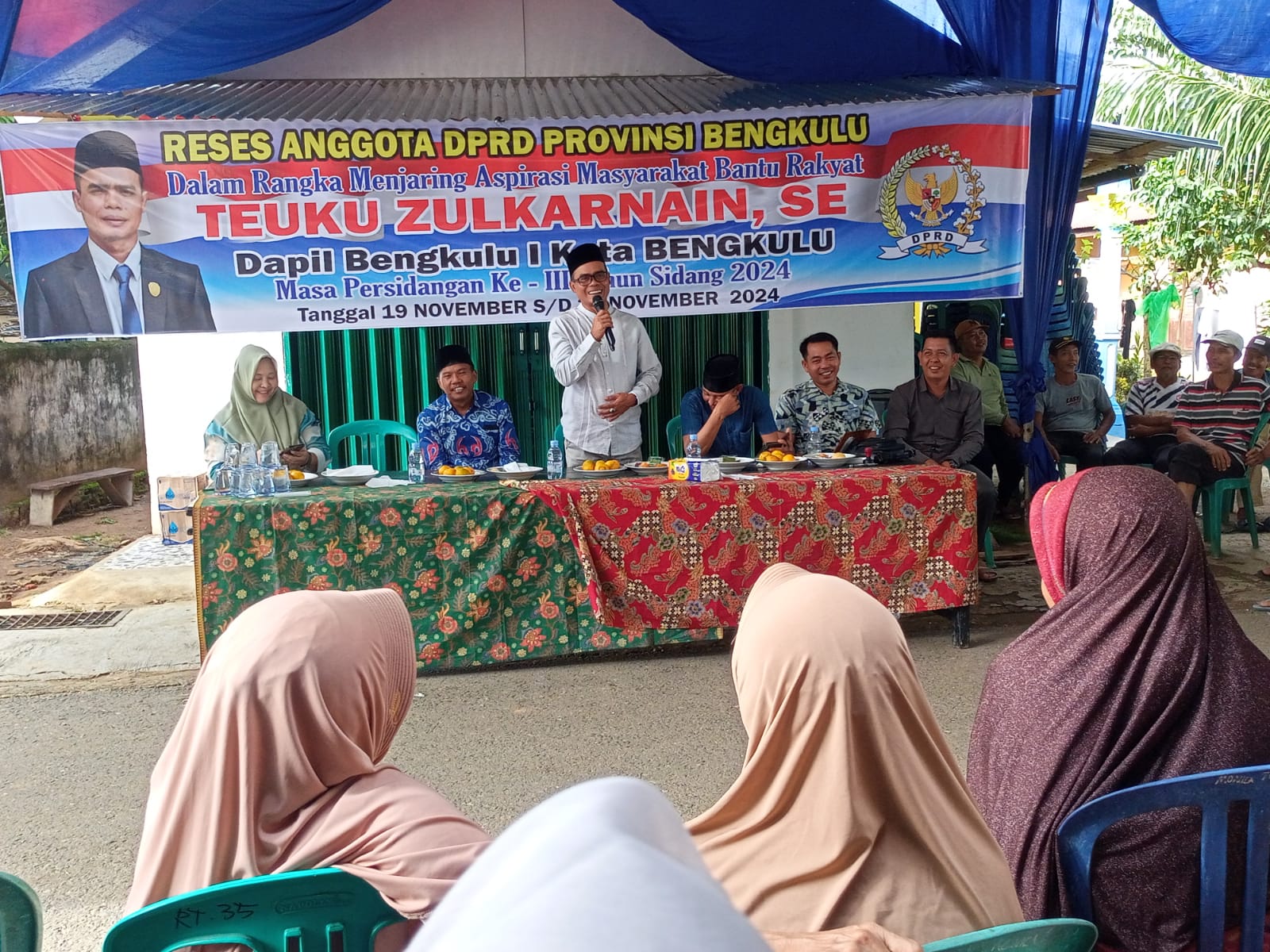 BencoolenTimes.com – Reses titik kedua anggota DPRD Provinsi Bengkulu Dapil Bengkulu 1 Kota Bengkulu, Teuku Zulkarnain dalam rangka menjaring aspirasi masyarakat dalam masa persidangan ke-3 tahun 2024 di Kelurahan Pematang Gubernur pada Jumat sore, 22 November 2024.