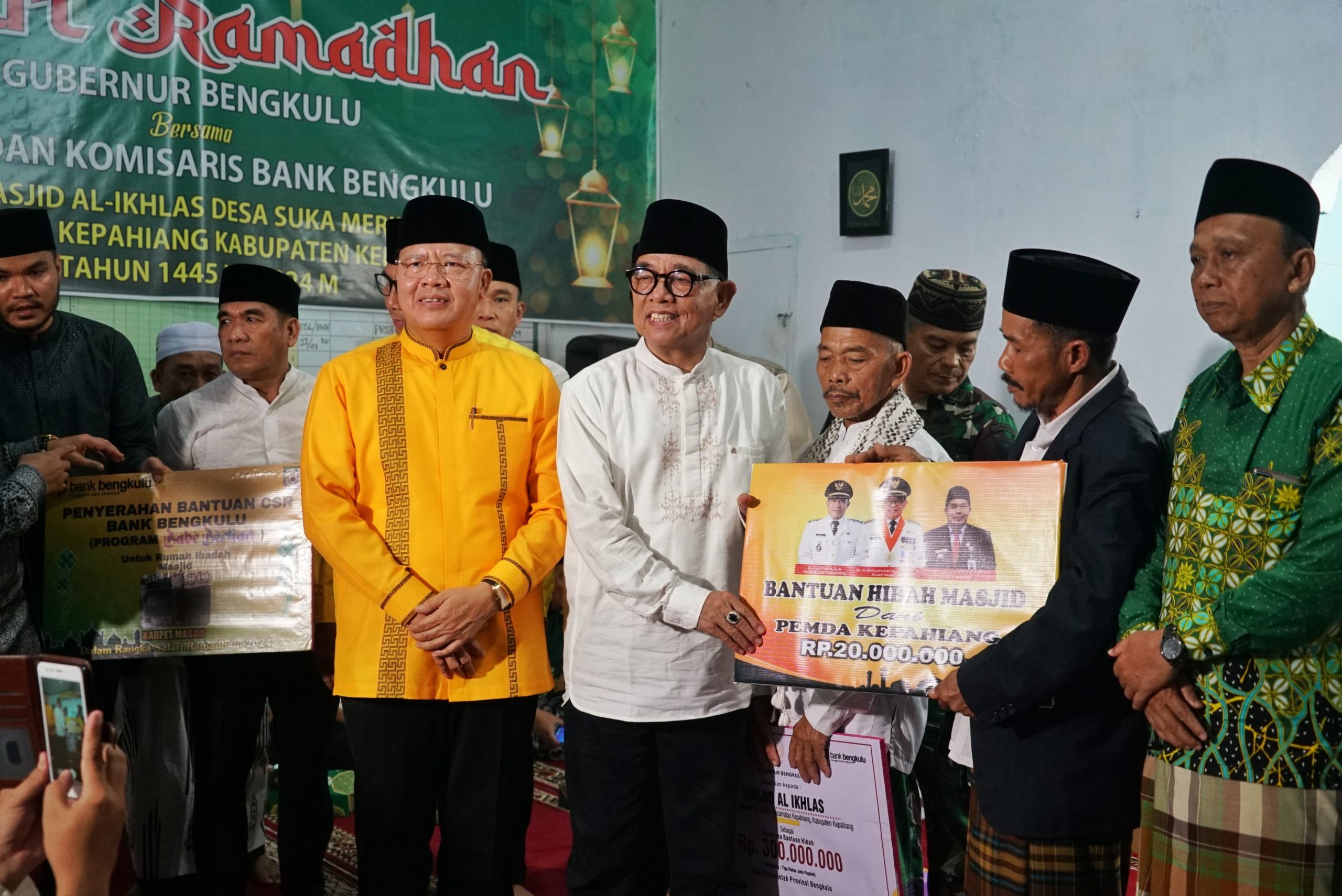 Gubernur Rohidin Mersyah menyerahkan bantuan dana hibah sebesar Rp 300 juta rupiah yang diperuntukan untuk Pembangunan Masjid Al-Ikhlas desa Suka Merindu Bengkulu.