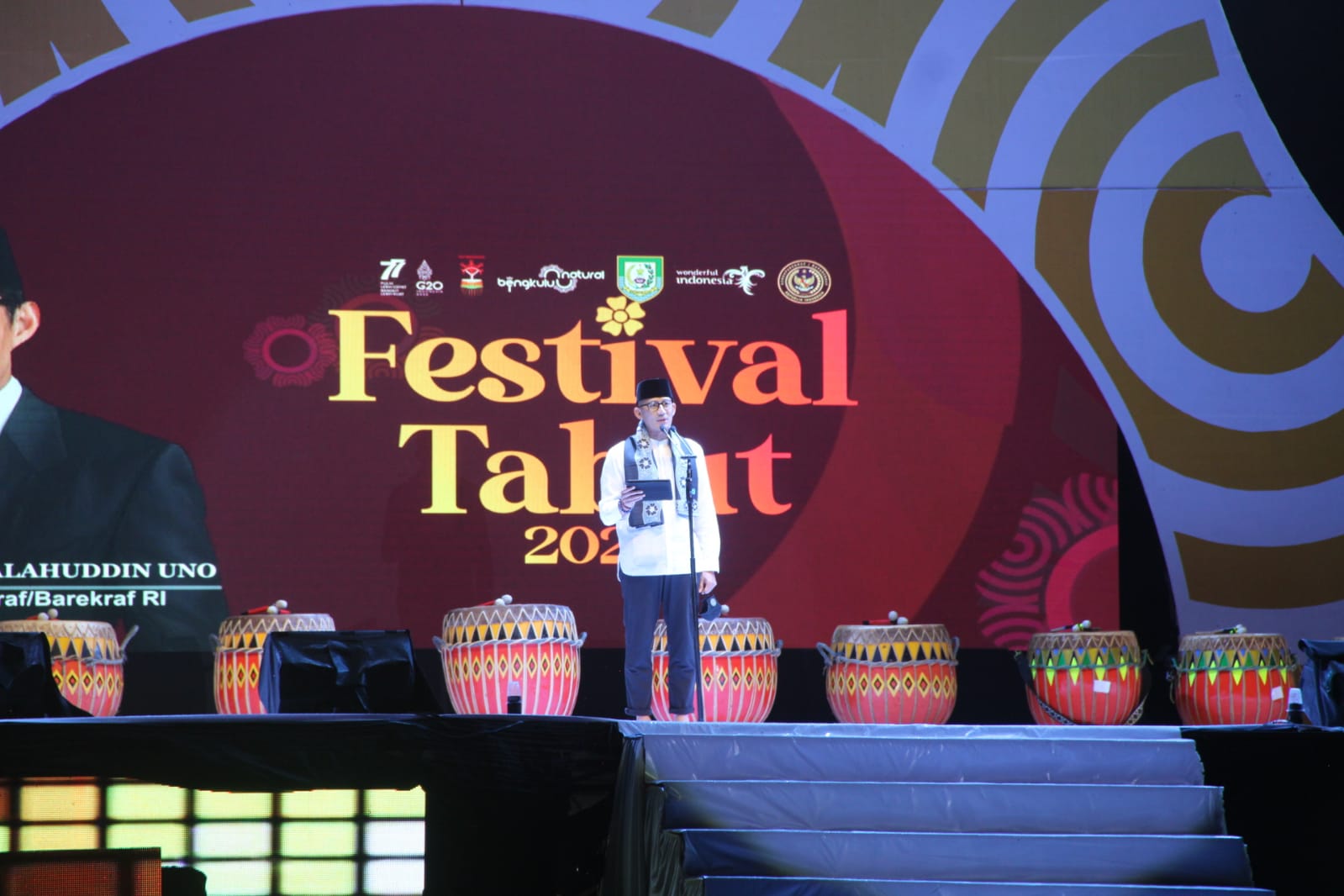 “Sesuai dengan pembicaraan kami dengan Pak Gubernur Rohidin, dengan Ibu Dewi dan Pak Sultan, tahun depan Tabut Bengkulu kita tingkatkan menjadi Festival Internasional,” jelas Menparekraf Sandiaga Uno saat hadir pada Pagelaran Seni & Budaya Festival Tanut 2022 di Lapangan Merdeka Bengkulu, Selasa (02/08/2022).