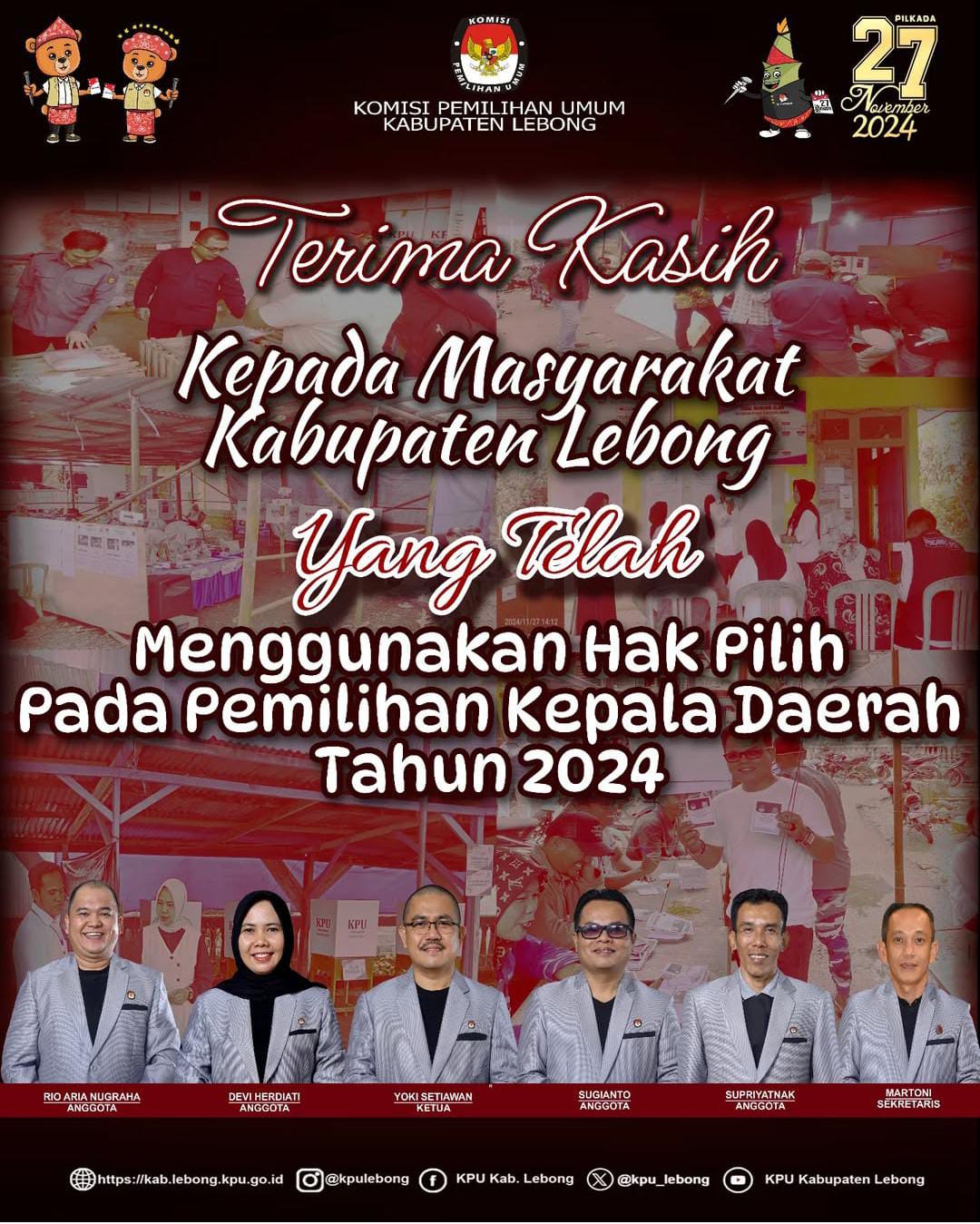 Ditambahkan Yoki, KPU Kabupaten Lebong juga menyampaikan Ucapan Terimakasih kepada seluruh Masyarakat Kabupaten Lebong. Yang telah menggunakan hak pilih mereka saat Pilkada, Rabu, 27 November Tahun 2024. ‘’Kita ucapkan terimakasih atas dukungan Masyarakat Kabupaten Lebong, terkhusus yang sudah menggunakan hak pilih mereka, hingga Pilkada Lebong Tahun 2024 berjalan sukses,’’ demikian Yoki.(OIL)