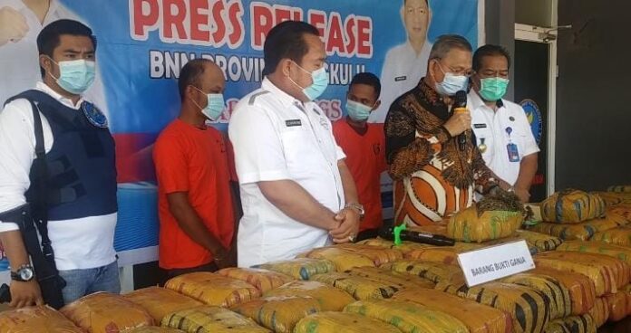 “Total ganja yang kita amankan seberat 143 kilo gram ganja. Apabila diunangkan sekitar Rp700 juta. Barang bukti lain yang kita amankan yakni mobil truk yang digunakan mengangkut ganja dan dua unit Handphone,” kata Supratman, di Kantor BNNP Bengkulu, Sabtu (16/10/2021). (Bay)