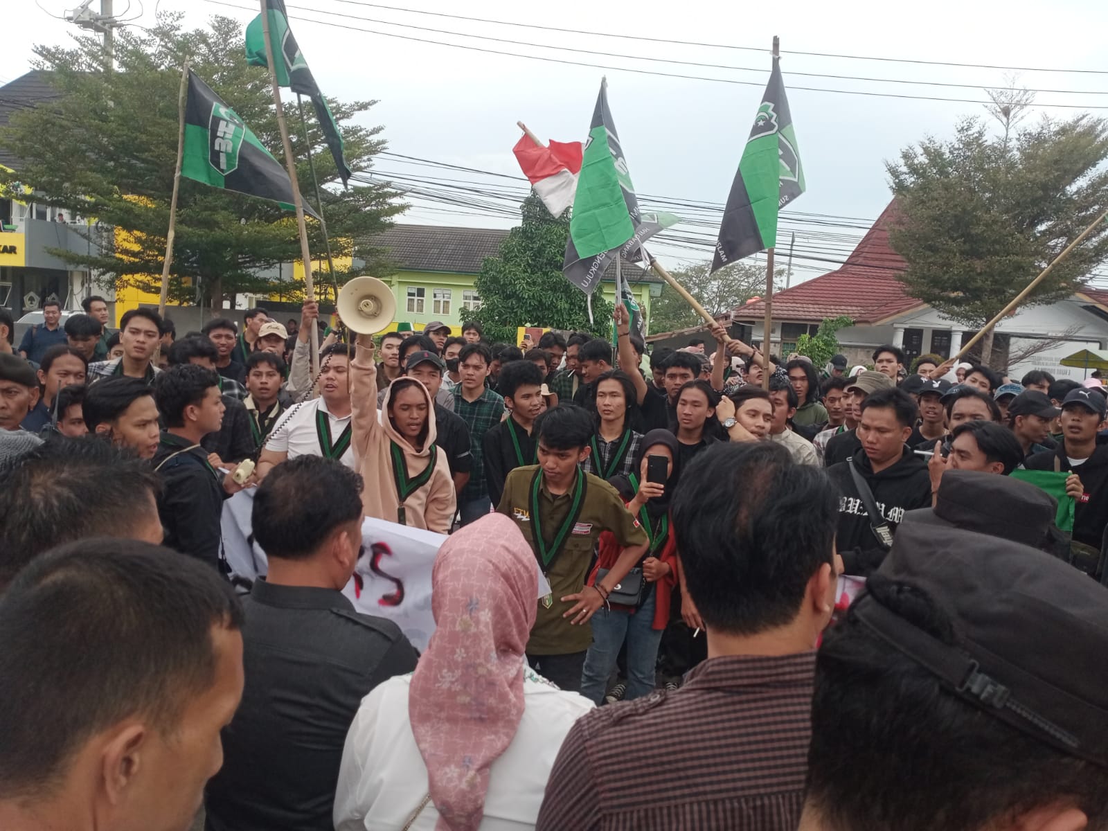 BencoolenTimes.com, – Ratusan mahasiswa kader Himpunan Mahasiswa Islam (HMI) Cabang Bengkulu demo di depan Gedung DPRD Provinsi Bengkulu, menolak revisi Undang-undang, nulai revisi Undang-undang TNI/POLRI, UU Penyiaran, Selasa (25/6/2024).