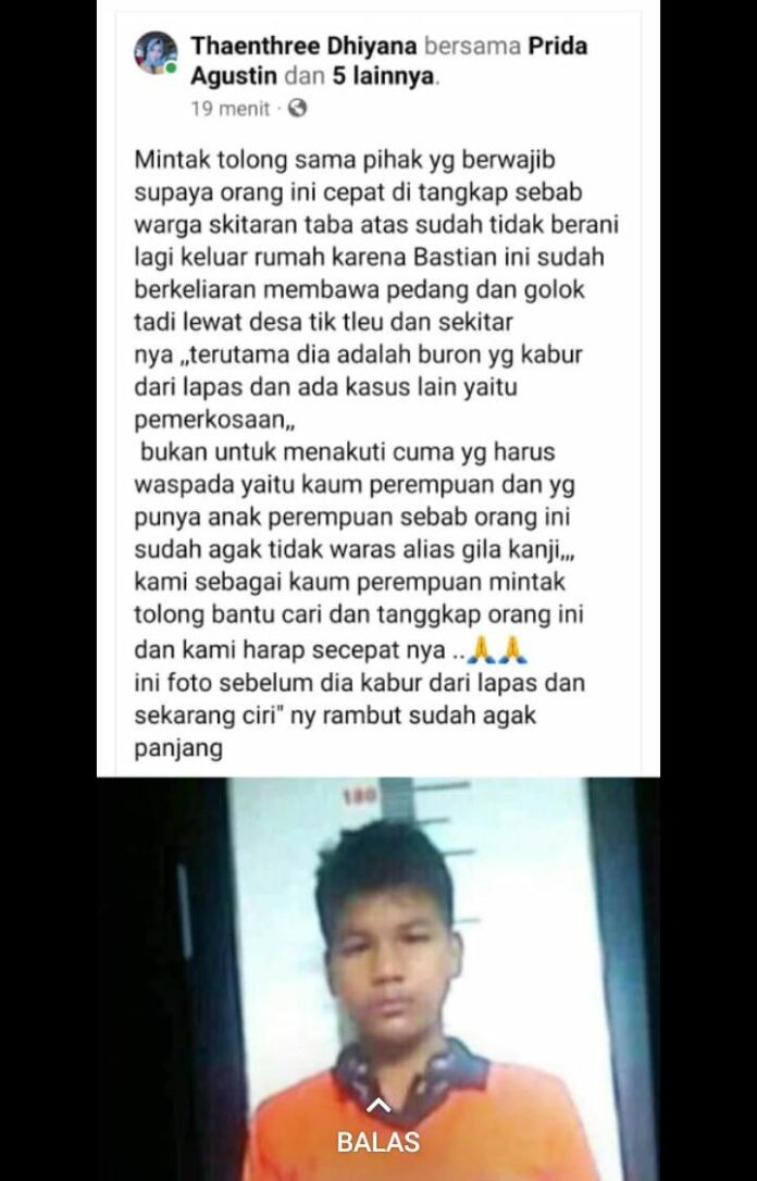 “Terutama BA adalan buron yang kabur dari lapas dan ada kasus lain yaitu pemerkosaan,” tulisnya di dinding FBnya Minggu (21/11/2021).