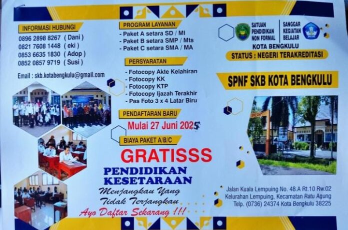 BencoolenTimes.com – Pemerintah Kota Bengkulu melalui Satuan Pendidikan Nonformal (SPNF) dan Sanggar Kegiatan Belajar (SKB) membuka kesempatan bagi warga yang putus sekolah untuk melanjutkan pendidikan dan mendapatkan ijazah setara SD, SMP, dan SMA/SMK secara gratis.